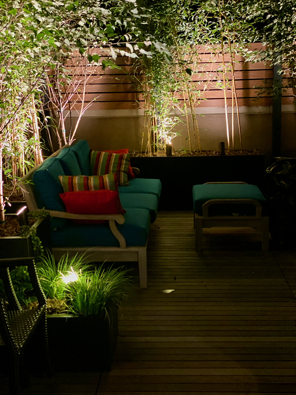These Hoboken clients knew they needed to transform their roof deck into a functional and private space the whole family could eat and relax together while still retaining privacy and create an urban jungle vibe. We used bamboo, birch trees, and custom planters for a natural privacy hedge to do just that. Installing custom Ipe bench and fence, an outdoor TV for football in the fall and adding a custom stone veneer grill with stainless steel appliances left us certain the space will be the center of many good times and meals to come.