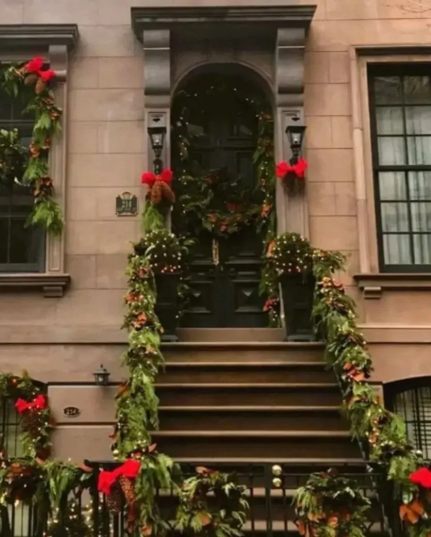 • 4 wreaths with bows or decorative plants and boxes on the steps
